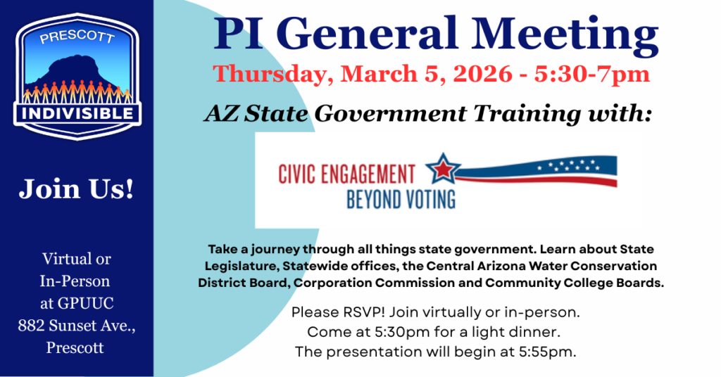 PI General Meeting: March 5, 2026 by Prescott Indivisible | Feb 8, 2026 | Homepage Register Here: https://www.mobilize.us/prescottindivisible/event/899206/